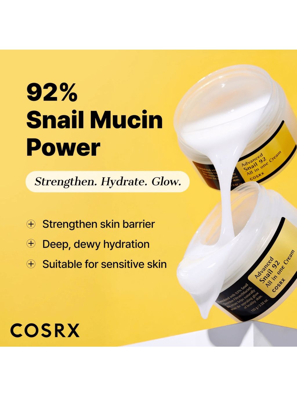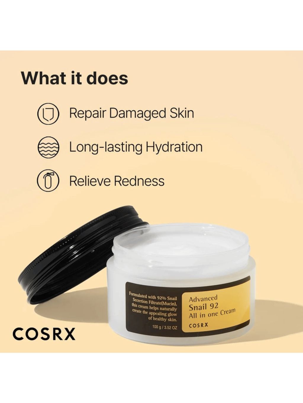 Tento krém je obohatený o 92 % filtrátu slimačieho sekrétu (Snail Secretion Filtrate) a pomáha vytvoriť hydratačnú bariéru, vďaka ktorej je pleť pružnejšia, hydratovaná a upokojená. Ľahko sa rozotiera, podporuje prirodzený jas pleti a nezanecháva lepkavý film.