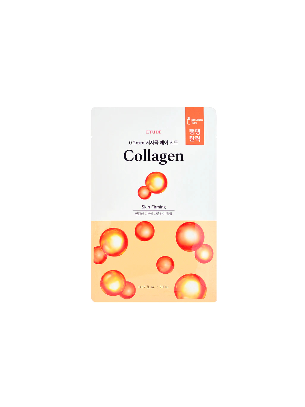 ETUDE HOUSE 0.2mm Therapy Air Mask - Collagen je ultra tenká plátenková maska, ktorá poskytuje intenzívnu výživu a spevnenie pleti vďaka obsahu hydrolyzovaného kolagénu. Táto maska je navrhnutá tak, aby obnovila pevnosť a pružnosť pokožky, čím zanecháva pleť hladšiu, mladistvejšiu a hydratovanú. Vďaka svojej ultraľahkej vrstve s hrúbkou len 0,2 mm, maska dokonale prilieha k tvári a umožňuje efektívne vstrebávanie účinných látok bez zaťaženia pokožky.PREČO SI JU ZAMILUJETE: