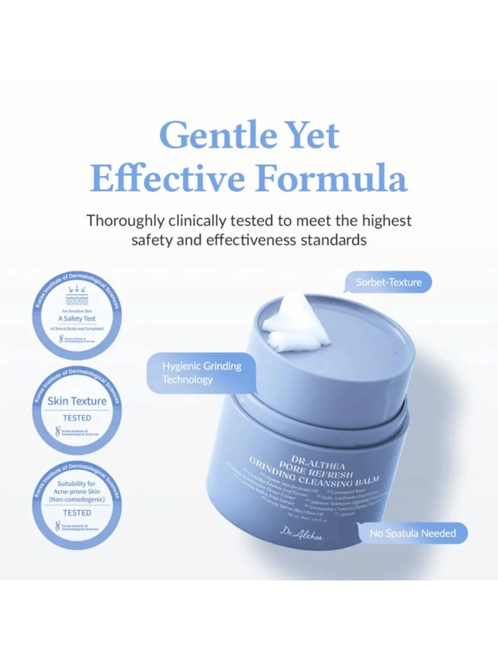 Predstav si, že večerné odličovanie je ako jemný rituál, ktorý tvojej pleti vracia rovnováhu. DR. ALTHEA - Pore Refresh Grinding Cleansing Balm spája upokojujúce rastlinné extrakty a účinné oleje do luxusného balzamu, ktorý účinne rozpustí make-up, SPF aj maz – a pritom rešpektuje prirodzenú rovnováhu tvojej pokožky.
