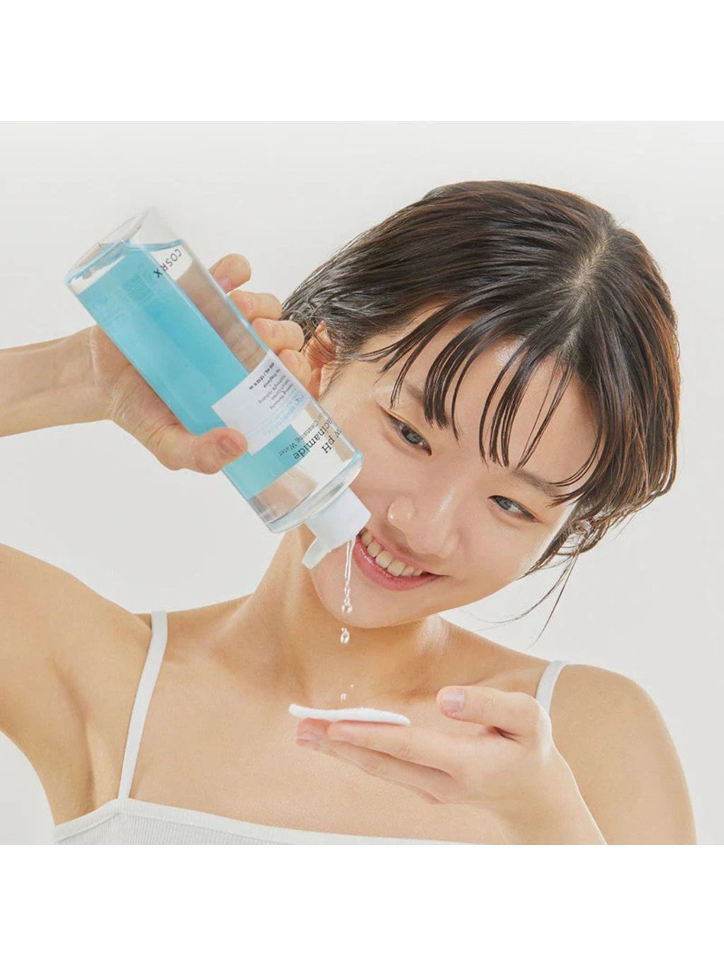 - 1️⃣ Nalej micelárnu vodu na tampón