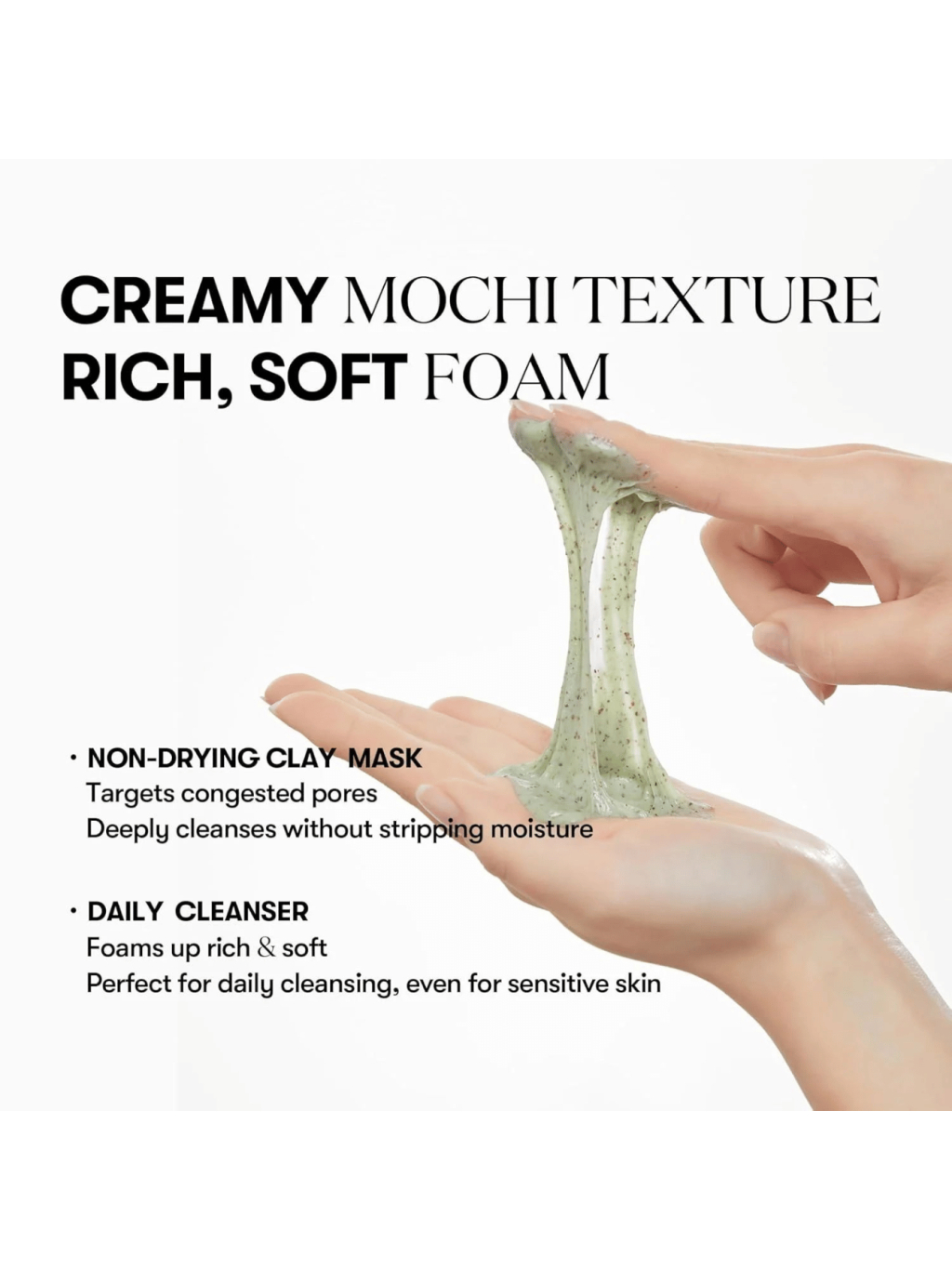 Krémová, "mochi" ílová pasta, ktorá sa na pleti príjemne prichytí a po pridaní vody sa premení na mäkkú penu so zamatovým dočistením.