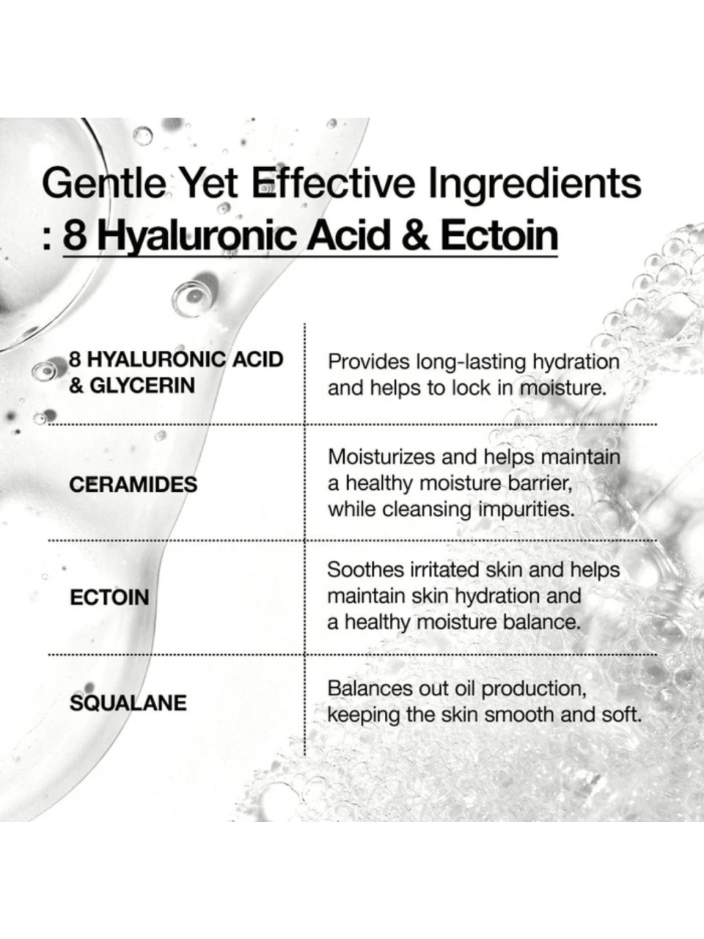Jemný gélový čistič, ktorý nevysušuje - 8 typov kyseliny hyalurónovej, squalan a ceramid NP posilňujú bariéru a zanechajú pleť pružnú a sviežu.