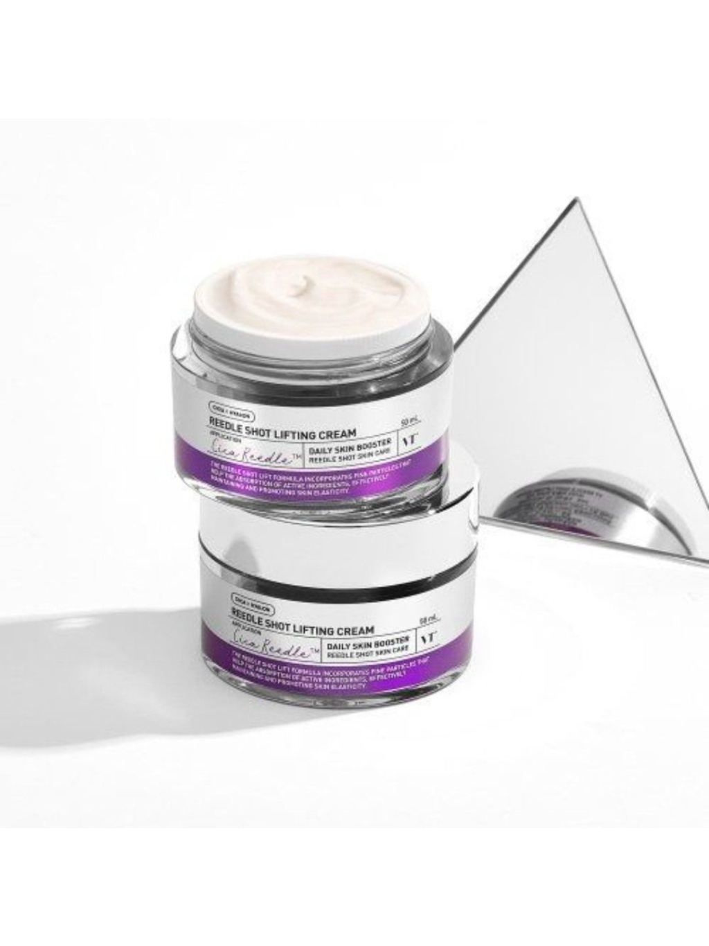 VT cosmetics Reedle Shot Lifting Cream Liftingový krém s mikroihličkovou technológiou je revolučný prípravok s technológiou CICA REEDLE™, ktorá obnovuje pružnosť vašej pokožky, minimalizuje jemné vrásky, aby ste získali mladistvú a sviežu pleť. O zvýšenie elasticity pleti sa postará acetylhexapeptid-8 a extrakt z upravených ľudských pupočníkových mezenchymálnych kmeňových buniek, ktoré revitalizujú unavenú a starnúcu pokožku. Liftingový krém poskytuje pleti starostlivosť o textúru pokožky a má tiež vďaka extraktu z pupočníka ázijského upokojujúci účinok. Pokročilá technológia VDS (VT Delivery System) zabezpečuje hlbokú absorpciu aktívnych zložiek, čím napomáha výraznému zlepšeniu pružnosti a pevnosti pokožky. Vaša pleť sa pri pravidelnom používaní krému stáva pevnejšia, omladenejšia, žiarivejšia, pružnejšia a hĺbkovo hydratovaná. Receptúra Lipozómu 100 zvyšuje absorpciu aktívnych zložiek ako kolagén, elastín a kyselina hyalurónová, čím dokonale zakončí celý proces liftingu a vstrebávania účinných zložiek do pleti.