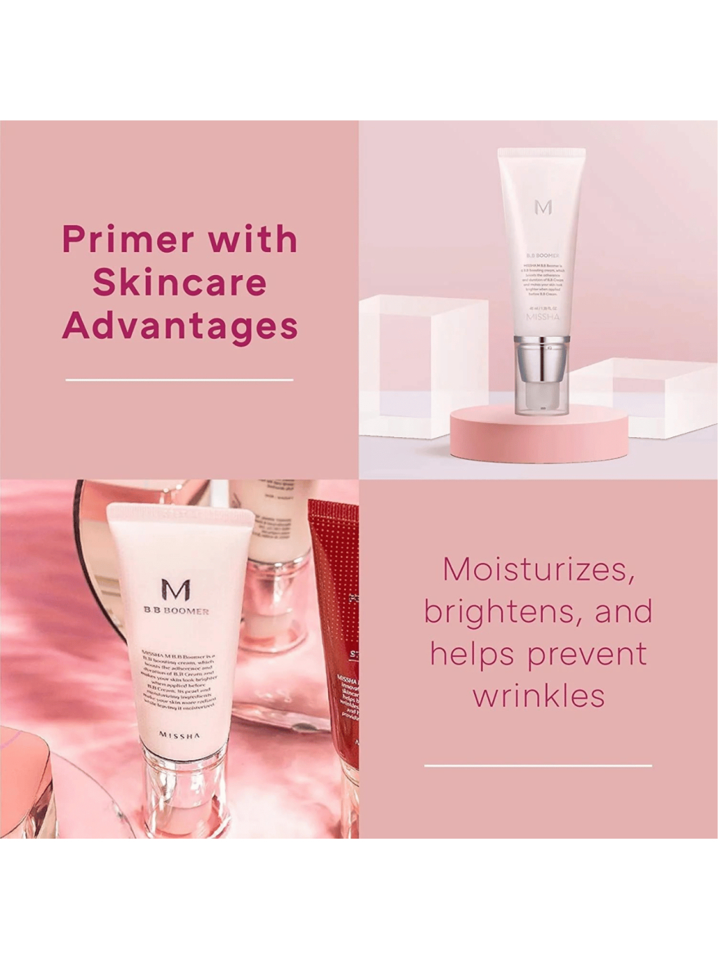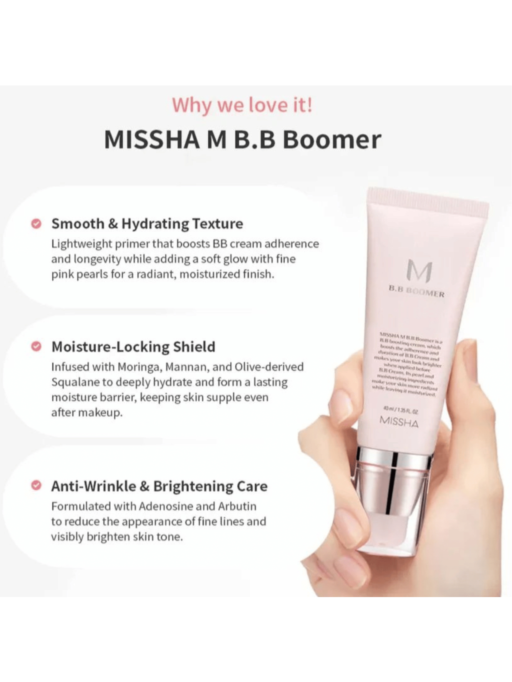 Hľadáš ten nenápadný trik, po ktorom tvoja pleť vyzerá ako po filtroch, ale naživo? MISSHA M BB Boomer je kórejská báza, ktorá z tvojho BB krému vytiahne maximum. Funguje ako inteligentný podklad, čo zvýši priľnavosť a predĺži výdrž make-upu, zároveň pleť okamžite rozjasní ružovo-perleťovým efektom a zjemní nerovnosti. Vďaka hydratačnej kombinácii glycerínu a skvalánu sa krémovo-ľahko kĺže po pleti, nezanecháva lepkavý pocit a vytvorí komfortný, jemne dewy finiš. Niacínamid pomáha rozjasniť mdlý tón a opticky zjednotiť pleť, adenozín podporuje hladší vzhľad jemných liniek. Unikátny mix perlového a diamantového púdru, rubínu a ametystu dodá zdravý lesk bez masiekového efektu. K tomu moringový olej napomáha vytvoriť ochranný hydra-film, takže podklad drží aj počas náročného dňa. M BB Boomer je dlhoročný K-beauty miláčik, ku ktorému sa ženy vracajú, lebo v jednom kroku vyhladí póry, rozžiari a udrží BB krém na mieste. Ak chceš prirodzene sviežu pleť, ktorá vyzerá skvelo naživo aj na fotkách, toto je tvoj nový go-to základ.