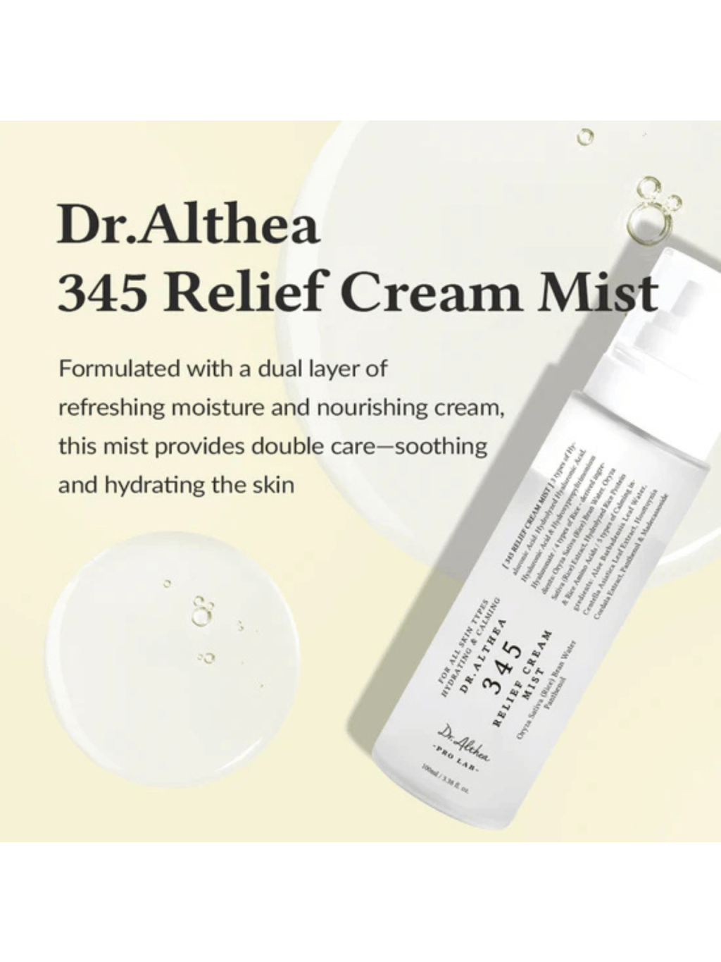 Predstav si okamžitú úľavu v podobe jemnučkej hmly, ktorá sa na pleti rozplynie ako nežný obláčik a zanechá ju hydratovanú, hladkú a upokojenú. DR. ALTHEA 345 Relief Cream Mist je tvoja nová skrášľujúca skratka, keď chceš mať komfort krému a sviežosť esencie v jedinom kroku. Dvojvrstvové zloženie s Oryza Sativa (Rice) Bran Water bohatou na minerály a aminokyseliny, doplnené o Panthenol a viacero foriem kyseliny hyalurónovej (Hydrolyzed Hyaluronic Acid, Hyaluronic Acid), sa postará o dlhodobé zvlhčenie aj citlivej pleti. Upokojujúci koktail s Madecassoside, Centella Asiatica Leaf Extract, Avena Sativa (Oat) Kernel Extract a fermentmi (Lactobacillus Ferment, Bifida Ferment Extract, Streptococcus Thermophilus Ferment) pomáha znížiť začervenanie, posilniť kožnú bariéru a navrátiť pleti komfort bez pnutia. Ultraľahká hmla zanechá prirodzene hebký finiš bez lepenia a je skvelá pred make-upom, po odlíčení aj kedykoľvek počas dňa. Ak miluješ produkty, ktoré prinášajú viditeľný efekt bez komplikovaných krokov, 345 Relief Cream Mist bude tvoj must-have do kabelky aj do kúpeľne.