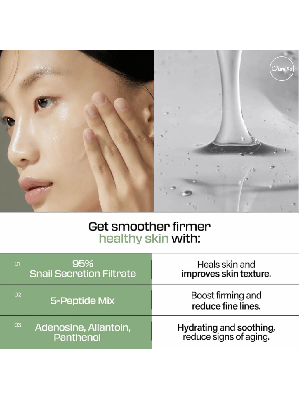 Intenzívna regeneračná esencie JUMISO s 95% slimáčieho mucínu a komplexom peptidov podporuje obnovu pleti, vyhladzuje vrásky a dodáva pružnosť.