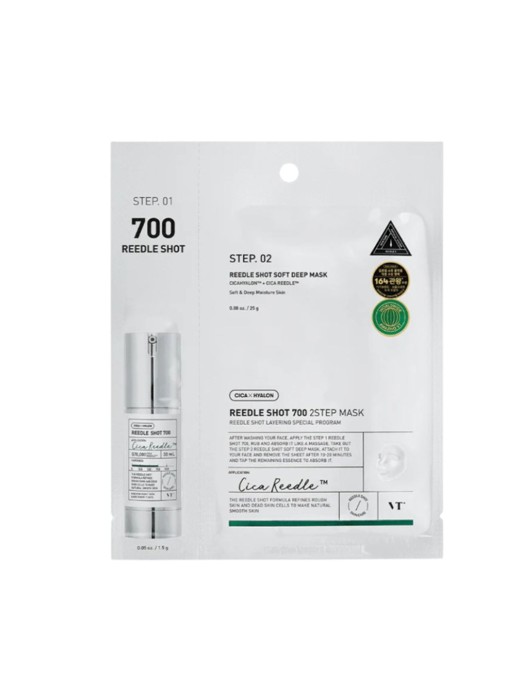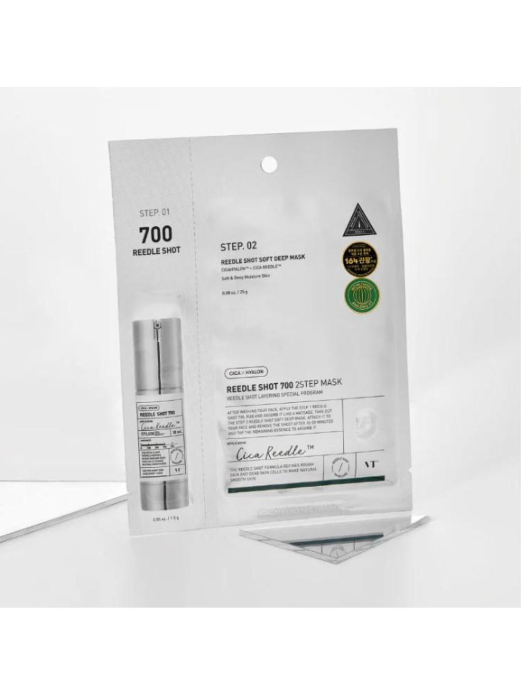 VT Cosmetics Reedle Shot 700 2 Step Mask je jedinečná dvojfázová maska, ktorá využíva pokročilú technológiu CICA REEDLE™ na zlepšenie stavu pokožky a jej regeneráciu. Tento inovatívny produkt je navrhnutý tak, aby jemne stimuloval pleť a zlepšil jej schopnosť absorbovať aktívne zložky. Krok 1 využíva silu Reedle Shot 700 na zlepšenie obnovy a zdravia pokožky, zatiaľ čo krok 2 prináša hydratačnú masku, ktorá dodáva pleti bohaté hydratačné a vyživujúce látky. Maska napomáha odstrániť odumreté kožné bunky, zjemňuje drsnú pokožku a zanecháva ju jemnú a hladkú.PREČO SI JU ZAMILUJETE:Zamilujete si VT Cosmetics Reedle Shot 700 2 Step Mask pre jej schopnosť jemne stimulovať pokožku a zlepšiť jej prirodzené regeneračné schopnosti. Vďaka CICA REEDLE™ technológii maska poskytuje až 14-krát lepšiu absorpciu účinných látok než bežné produkty. Výsledkom je hladká, hydratovaná a pevná pokožka s mladistvým vzhľadom.HLAVNÉ ZLOŽKY:- Centella Asiatica Extract: Upokojuje podráždenú pleť a podporuje hojenie.