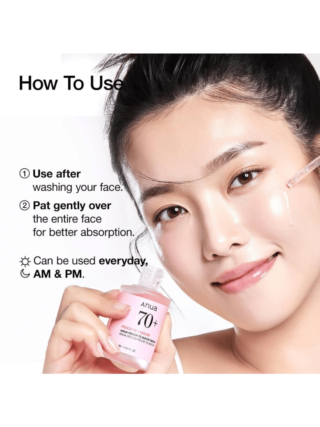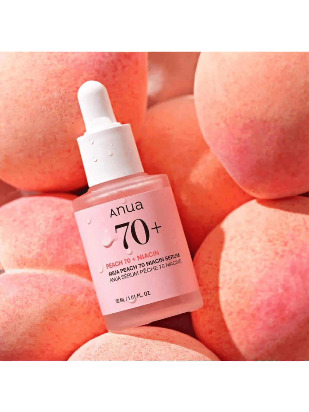 ANUA Peach 70 Niacin Serum - Niacínové sérum Anua Peach 70 je rozjasňujúce a hydratačné sérum na vyrovnanie tónu pleti a okamžité a dlhodobé dodanie sklenenej pleti tzv. glasskin. Obsahuje 70 % výťažku z broskyňového ovocia z ostrova Jeju a 5 % niacínamidu na zacielenie na tuposť a hyperpigmentáciu, pričom podporuje kožnú bariéru a znižuje vzhľad rozšírených pórov. Toto sérum tiež obsahuje silné hydratátory, ako je púštny kvasnicový olej a trojitá kyselina hyalurónová, ktoré dopĺňajú vlhkosť pokožky pre jemnejšiu pleť.