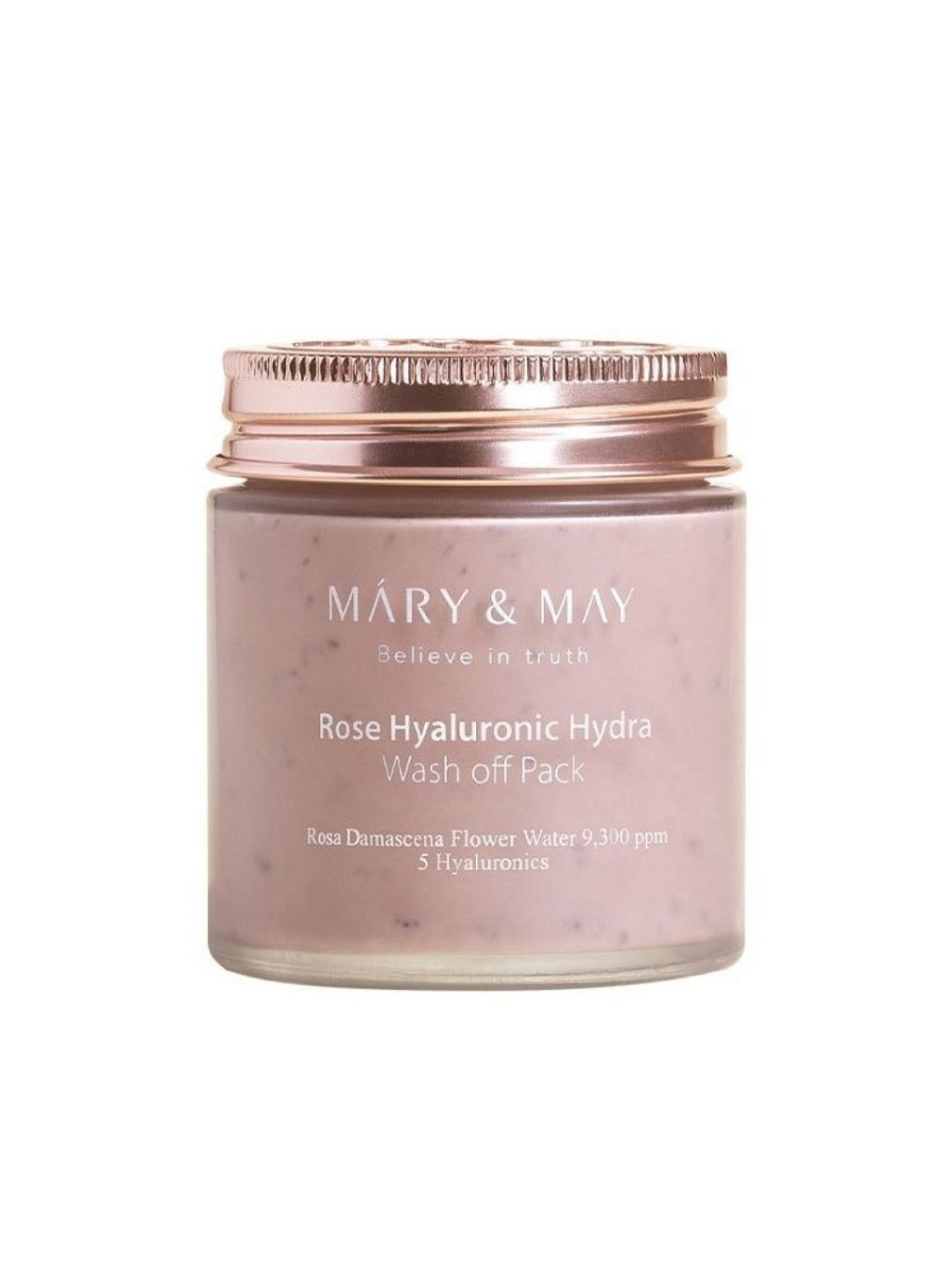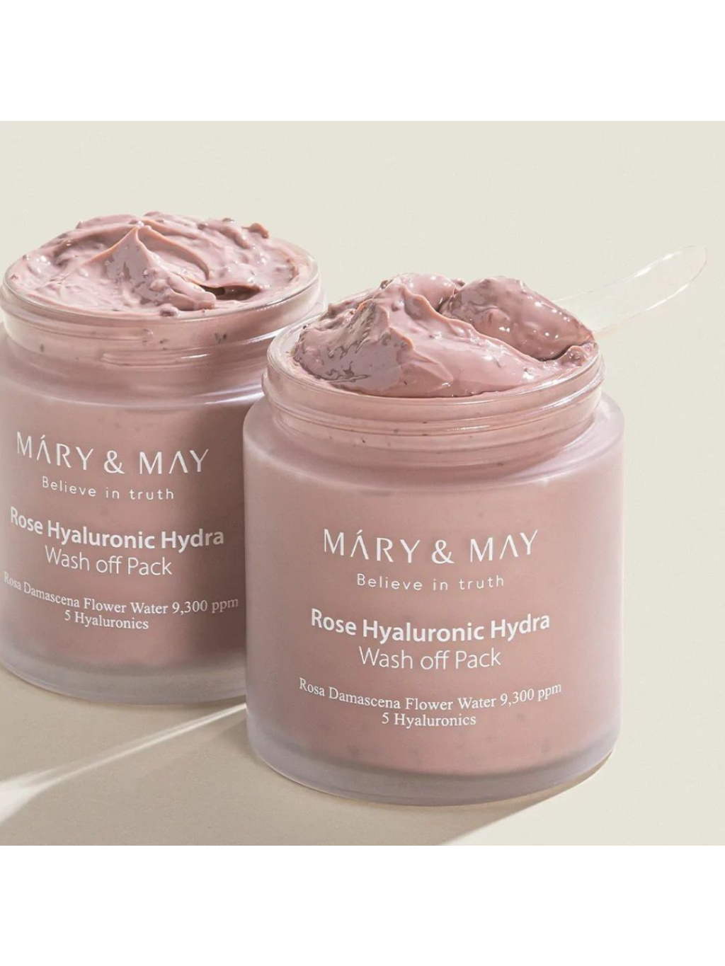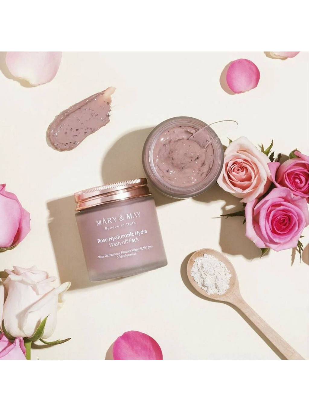 MARY & MAY Rose Hyaluronic Hydra Wash off Pack Hydratačná maska s extraktom z ruže rozmazná vašu pleť s bohatým extraktom z lupeňov francúzskej ruže, piatimi druhmi kyseliny hyalurónovej a vodou z damašskej ruže pre zvlhčenie a upokojenie pokožky.