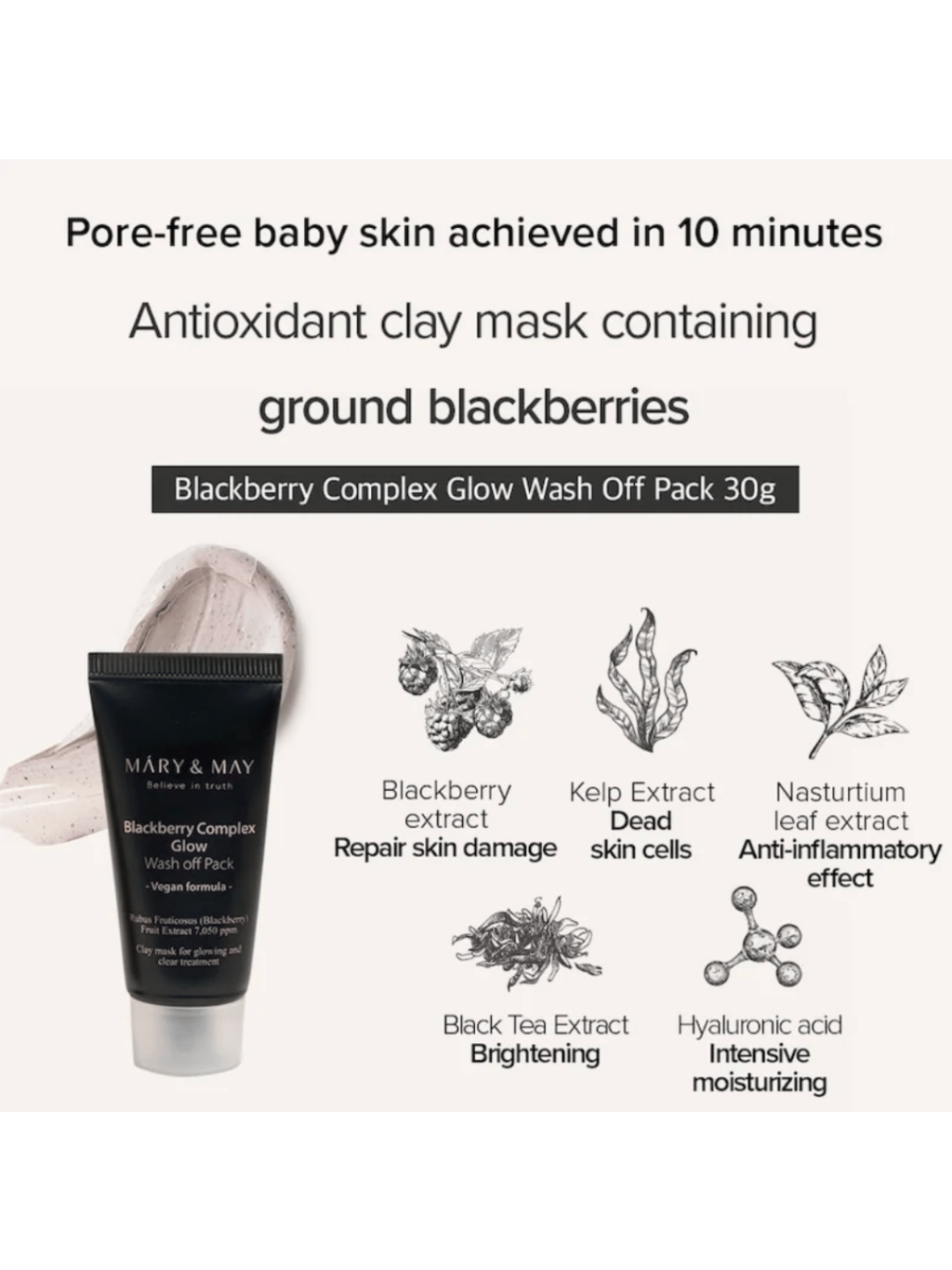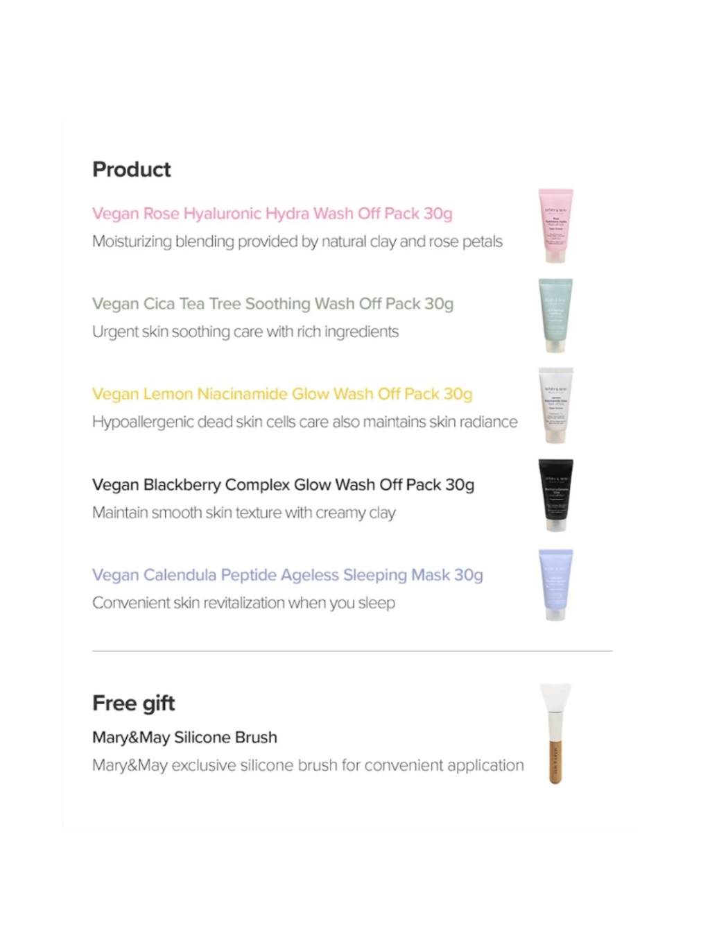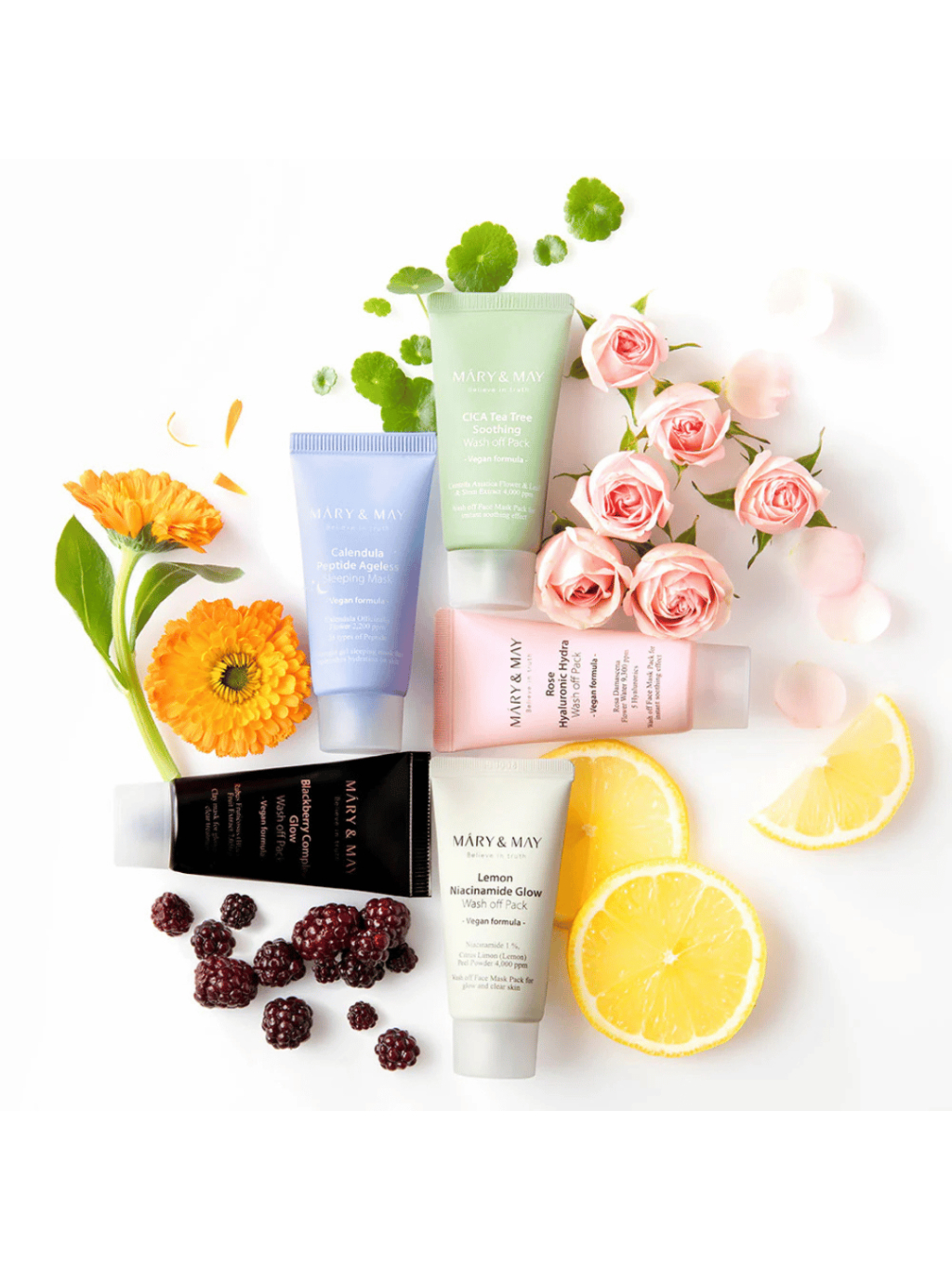 | Zloženie: | "[Mary&May CICA TeaTree Soothing Wash off Pack 30g] Water, Kaolin, Glycerin, Bentonite, Propanediol, 1,2-Hexanediol, Dipropylene Glycol, Calamine, Centella Asiatica Flower/Leaf/Stem Extract, Xanthan Gum, Butylene Glycol, Chlorella Vulgaris Powder, Iron Oxides(Ci 77492), Iron Oxides(Ci 77499), Centella Asiatica Extract, Houttuynia Cordata Extract, Ethylhexylglycerin, Mentha Arvensis Powder, Triethoxycaprylylsilane, Fragrance, Allantoin, Tocopherol, Melaleuca Alternifolia (Tea Tree) Leaf Extract, Ectoin [Mary&May Rose Hyaluronic Hydra Wash off Pack 30g] Water, Diglycerin, Glycerin, Kaolin, Bentonite, Propanediol, Zea Mays (Corn) Starch, 1,2-Hexanediol, Rosa Damascena Flower Water, Panthenol, Rosa Gallica Flower Powder, Xanthan Gum, Sodium Acrylate/Sodium Acryloyldimethyl Taurate Copolymer, Polyisobutene, Betaine, Butylene Glycol, Fragrance, Ethylhexylglycerin, Dipropylene Glycol, Iron Oxides(Ci 77491), Disodium Edta, Caprylyl/Capryl Glucoside, Sorbitan Oleate, Allantoin, Hydrogenated Lecithin, Centella Asiatica Extract, Ficus Carica (Fig) Fruit Extract, Ceramide Np, Sodium Hyaluronate, Tocopherol, Hyaluronic Acid, Sodium Hyaluronate Crosspolymer, Hydroxypropyltrimonium Hyaluronate, Sodium Acetylated Hyaluronate [Mary&May Blackberry Complex Glow Wash off Pack 30g] Purified water, kaolin, glycerin, bentonite, 1,2-hexanediol, dipropylene glycol, western raspberry extract, kelp extract, nasturtium leaf extract, black tea extract, hydrogenated lecithin, butylene glycol, xanthan gum, sweet Almond shell powder, allantoin, fructo-oligosaccharides, maniquagan clay, beta-glucan, Canadian colloidal clay, tocopherol, yeast fermentation filtrate, illite, hydrolyzed hyaluronic acid, montmorillonite, fragrance, Ethylhexylglycerin, Black Iron Oxide, Red Iron Oxide [Mary&May Calendula Peptide Ageless Sleeping Mask 30g] Purified water, denatured alcohol, methylpropanediol, 1,2-hexanediol, betaine, dipropylene glycol, gardenia extract, burdock root extract, mud mushroom extract, centella asiatica extract, fig extract, kava cover leaf/root/ Stem extract, Matricaria extract, feverfew extract, hydrogenated lecithin, sodium hyaluronate, port marigold flower, panthenol, acrylate/C10-30 alkyl acrylate crosspolymer, glycerin, tromethamine, butylene glycol Lycol, polyglyceryl-10, laurate, dextrin, sodium phytate, ceramide NP, tocopherol, acetyl hexapeptide-8, acetyl octapeptide-3, acetyl tetrapeptide-2, oligopeptide-6, tripeptide-1, Copper Tripeptide-1, Hexapeptide-2, Dipeptide-2, Acetyl Tetrapeptide-3, Acetyl Tripeptide-1, Hexapeptide-9, Tripeptide-2, Nonapeptide-1, Pentapeptide-3, Tripeptide -3, Alanine/Histidine/Lysine Polypeptide Copper HCL, Dipeptide-4, Acetyl Tetrapeptide-5, Palmitoyl Dipeptide-7, Palmitoyl Hexapeptide-12, Palmitoyl Tripeptide-1, Palmitoyl Tripeptide -5, palmitoylpentapeptide-4, dipeptide diaminobutyroylbenzylamide diacetate, palmitoyltetrapeptide-7, guaiazulene, fragrance, ethylhexylglycerin [Mary&May Lemon Niacinamide Glow Wash off Pack 30g] Water, Kaolin, Bentonite, Illite, 1,2-Hexanediol, Glycerin, Niacinamide, Neopentyl Glycol Diheptanoate, Dipropylene Glycol, Betaine, Propanediol, Citrus Limon (Lemon) Peel Powder, Polyacrylate-13, Xanthan Gum, Montmorillonite, 3-O-Ethyl Ascorbic Acid, Ethylhexylglycerin, Magnesium Aluminum Silicate, Hydrogenated Polyisobutene, Fragrance, Polyglyceryl-10 Laurate, Disodium Edta, Ethylhexyl Palmitate, Sorbitan Isostearate, Butylene Glycol, Quartz, Gluconolactone, Prunus Persica (Peach) Fruit Extract, Citric Acid, Tocopherol" |