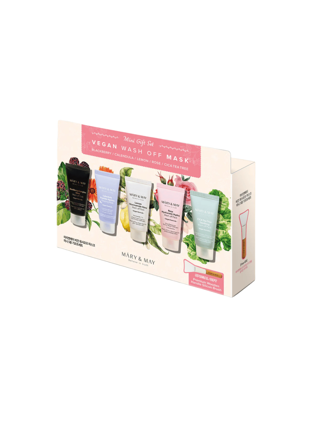 MARY & MAY - Vegan Wash Off Mask Mini Gift Set - Vegánsky mini set umývateľných a nočných masiek pre rozjasnenie, upokojenie a anti age 5 ks