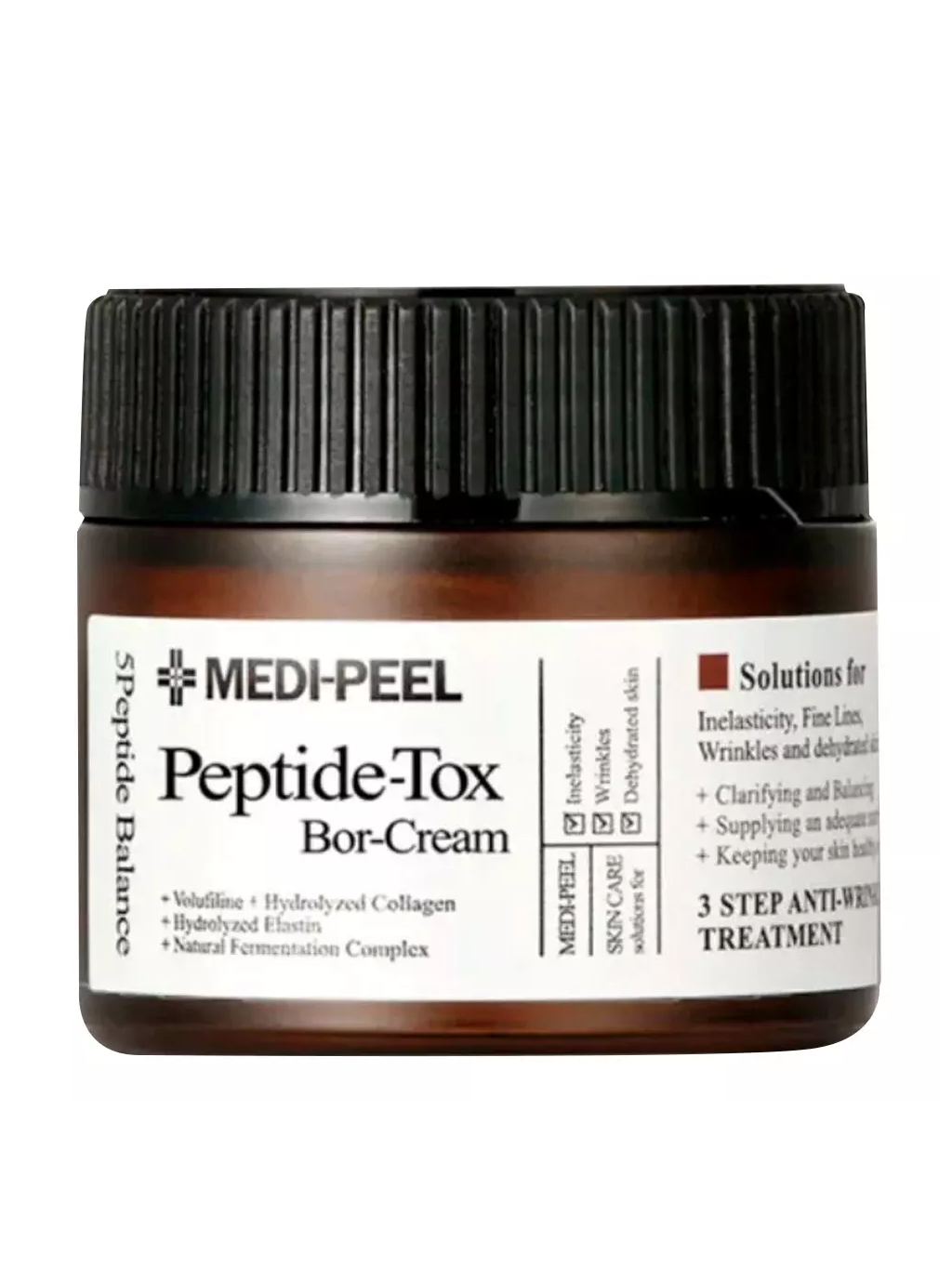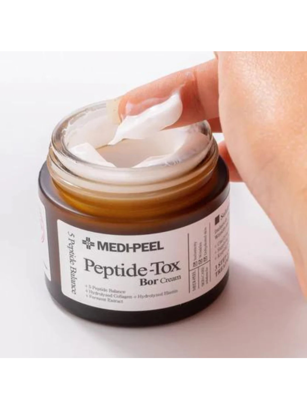 MEDI-PEEL Peptide-Tox Bor Cream -Liftingový krém s peptidovým komplexom Medi-Peel Peptide-Tox Bor Cream má výrazný účinok proti starnutiu. Zvýšená pevnosť a pružnosť pokožky, regenerácia pokožky, vrásky pokožky tváre sú hladšie. Spomaľuje proces starnutia, udržuje tón, hlboko vyživuje a hydratuje. Pôsobí ako botox, pomáha uvoľniť a uvoľniť napätie zo svalov tváre, predchádza vzniku bunkových tkanív a kožných záhybov. Napína pokožku, zlepšuje schopnosť buniek zadržiavať vlhkosť, rozpoznáva prejavy dehydratácie a dehydratácie.