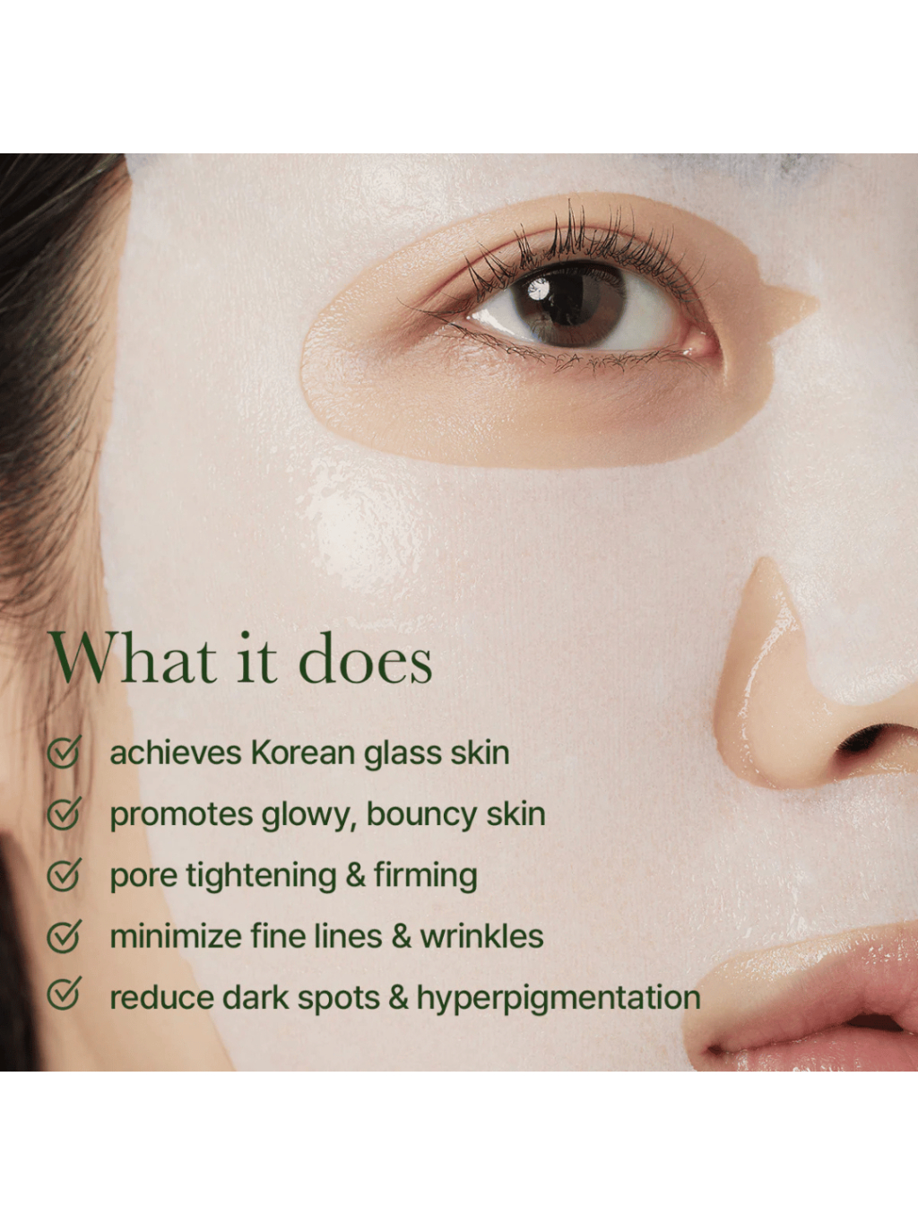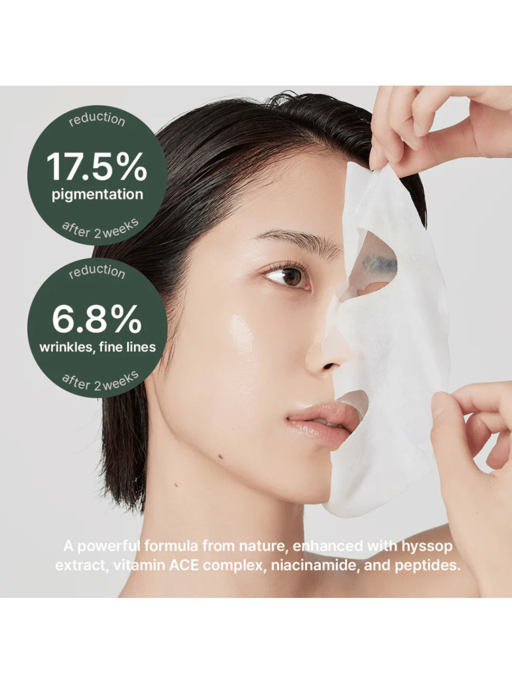 Rozjasňujúca plátenná maska s yzopom, niacínamidom, peptidmi a komplexom 8 druhov kyseliny hyalurónovej pre hladšiu, pružnú a žiarivú pleť.