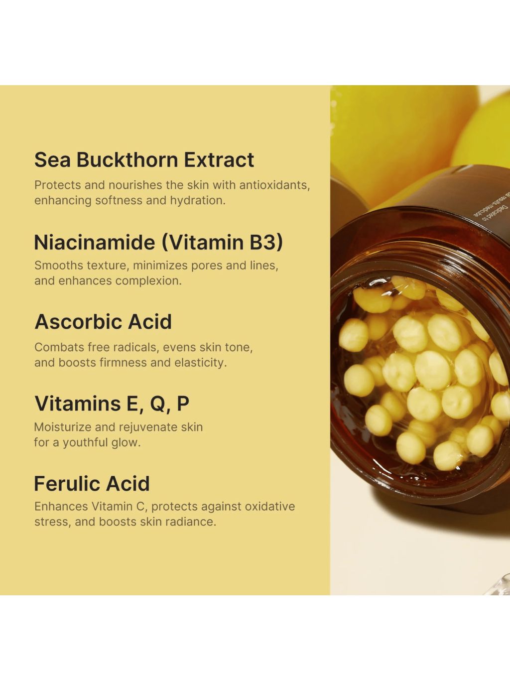 🧪 KONCENTROVANÉ ZLOŽENIE – MAXIMÁLNA ČERSTVOSŤ BEZ OXIDÁCIE. Obsahuje 50% extraktu z rakytníka, 5% niacínamidu a čistý vitamín C. Aktívne látky sú zapuzdrené tak, aby si zachovali účinnosť, čerstvosť a neoxidovali.
