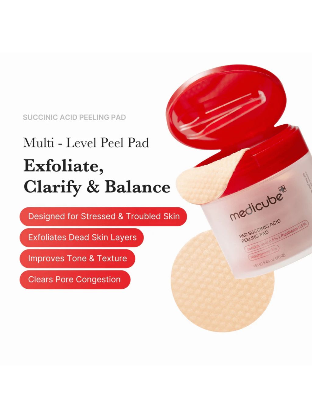 MEDICUBE - Red Succinic Peeling Pad - Peelingové tampóny so sukcinovou kyselinou na akné a póry 70 ks 155 g