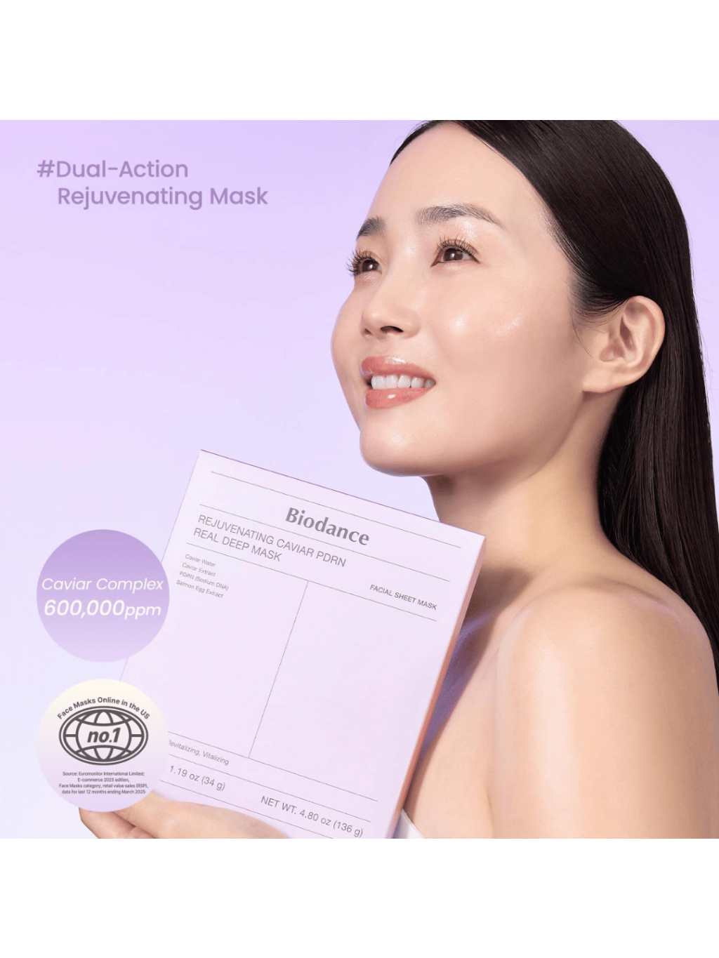 Rejuvenating Caviar PDRN Real Deep Mask od BIODANCE je luxusná hydrogelová maska, ktorú si zamiluješ od prvého priloženia. Zmes kaviárového komplexu a PDRN (Sodium DNA) pracuje na podpore prirodzenej obnovy pleti, zatiaľ čo niacínamid pomáha zjednotiť tón a vyhladiť textúru. Hydrogel sa pri nosení postupne stáva priesvitným a pevne priľne k pokožke, vďaka čomu aktívne látky prenikajú efektívnejšie a pleť je po sňatí viditeľne napitá, pružná a rozjasnená. Maska je vytvorená ako dlhotrvajúca starostlivosť – môžeš ju nechať pôsobiť 3-4 hodiny cez deň alebo si dopriať overnight rituál. Zloženie je premyslené aj pre náročné, citlivé typy pleti – bez zbytočných dráždivých látok, s upokojujúcimi extraktmi (allantoín, aloe, adenosín) a jemnými emolientmi pre saténový finiš. Ak túžiš po okamžite viditeľnom „plumped“ efekte, zdravom glowe a hladšej textúre bez ťažkého pocitu, táto maska je tvoje nové SOS pre unavenú pleť.