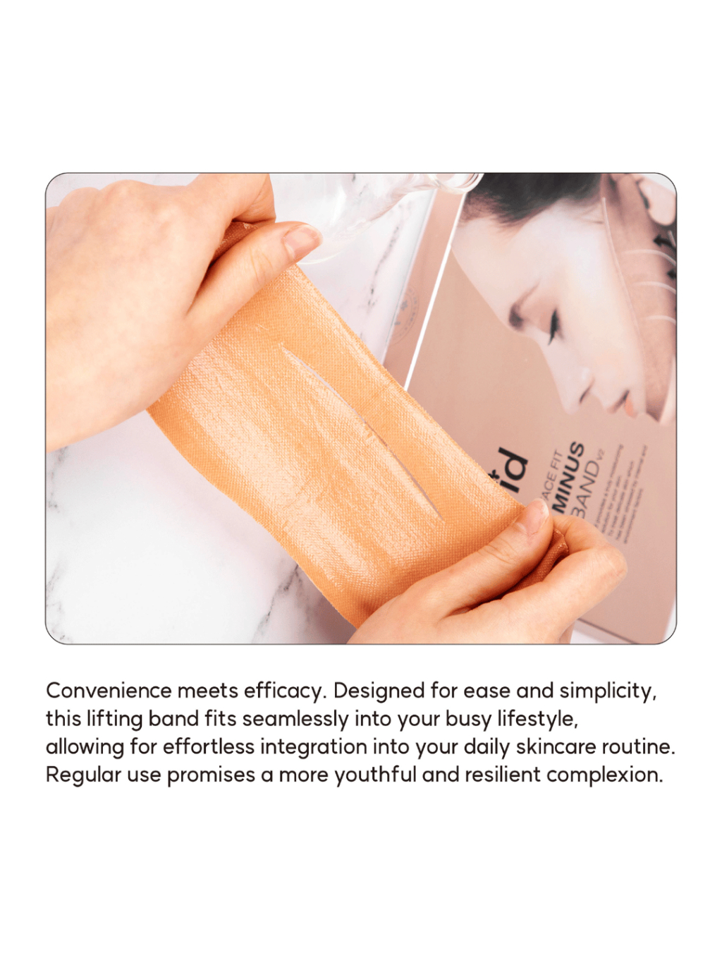 - 2️⃣ Band prilož pod bradu, natiahni a uchyť za uši.