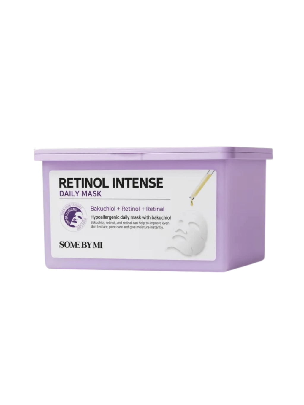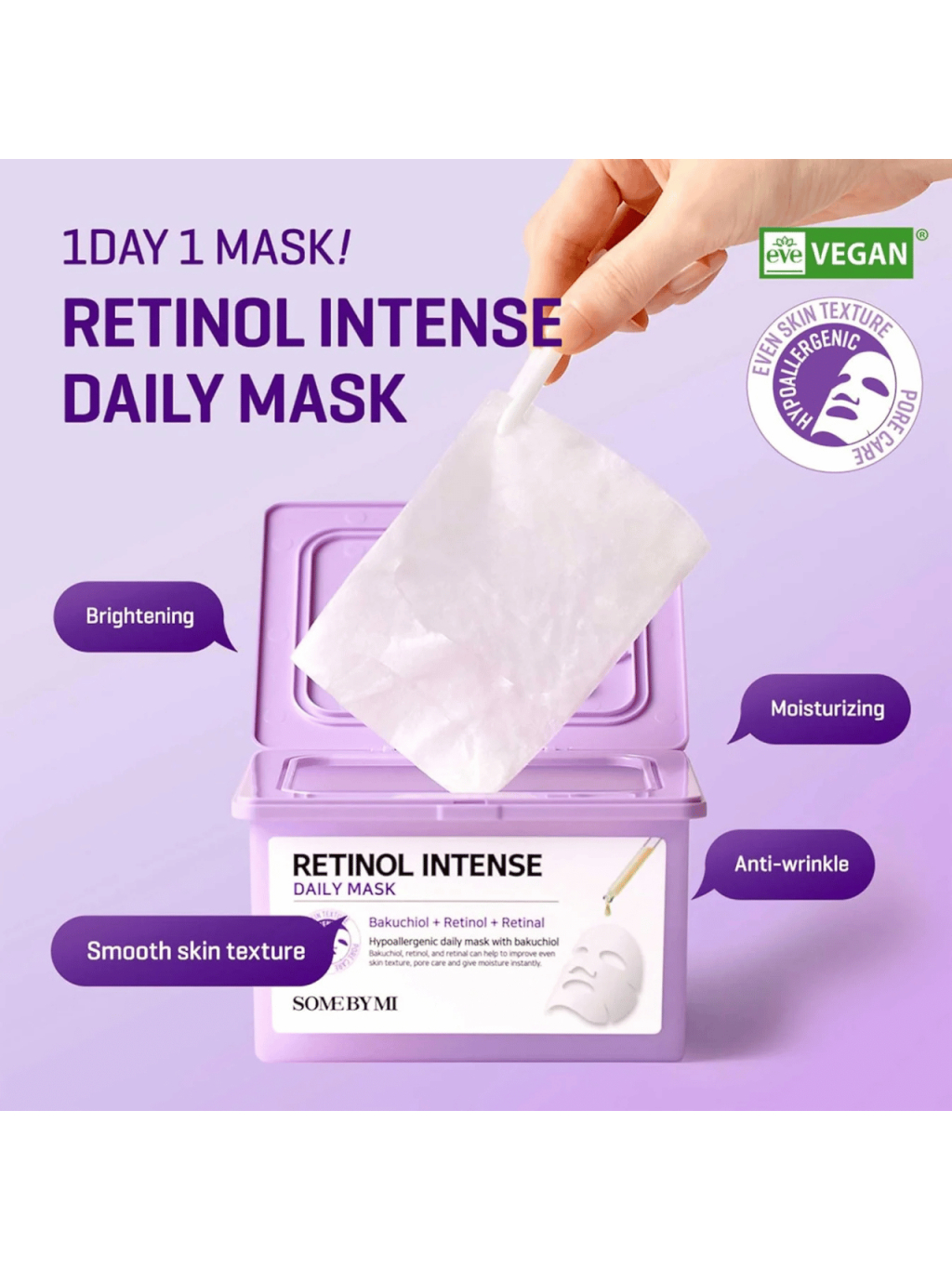 Dopraj si 30 dní luxusnej starostlivosti s SOME BY MI - Retinol Intense Daily Mask. Každá maska je napustená esenciou s retinolom, retinalom, bakuchiolu a 10 druhmi kyseliny hyalurónovej, ktoré spoločne pôsobia proti vráskam, obnovujú elasticitu a dodávajú pleti mladistvý vzhľad.