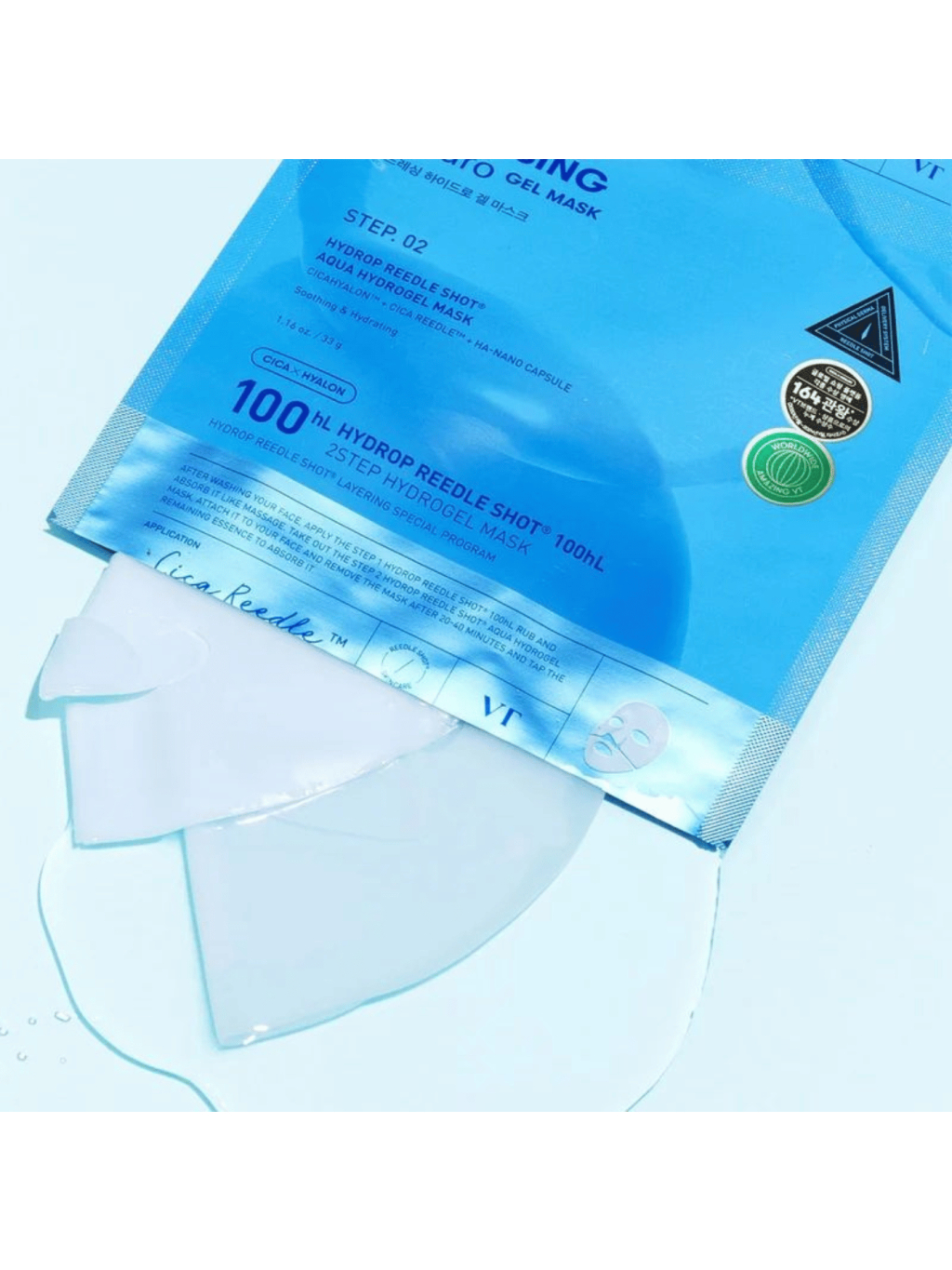 VT COSMETICS Hydrop Reedle Shot 100hL 2‑Step Mask je dvojfázová hydrogélová maska s patentovanou technológiou Cica Reedle™, ktorá pomocou mikro-ihličiek zlepšuje vstrebávanie aktívnych látok. Obsahuje nano-kapsulovanú kyselinu hyalurónovú (HA‑Nano Capsule), ektoín, niacínamid a silný hydratačný komplex. Použitie po očistení pokožky okamžite naplní hlbokou hydratáciou a zanechá ju sviežu, jasnú a pružnú.