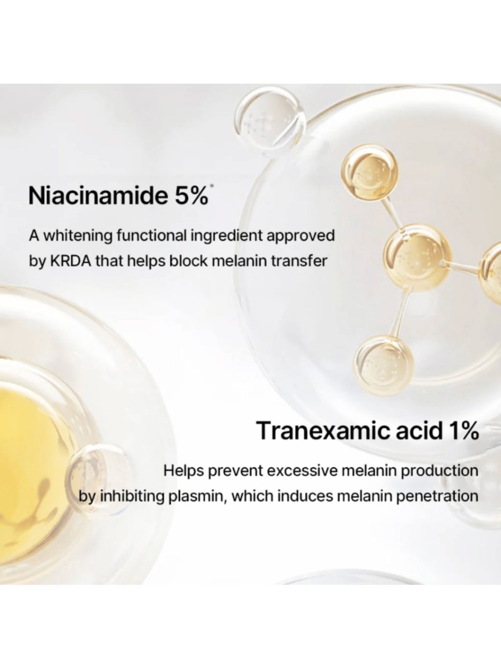 ✨ ZJEDNOTENIE TÓNU A STAROSTLIVOSŤ O TMAVÉ ŠKVRNY. Zloženie je obohatené o tranexamovú kyselinu a niacínamid, ktoré pomáhajú redukovať hyperpigmentáciu, podporujú rovnomernejší vzhľad pleti a rozjasňujú unavený tón.