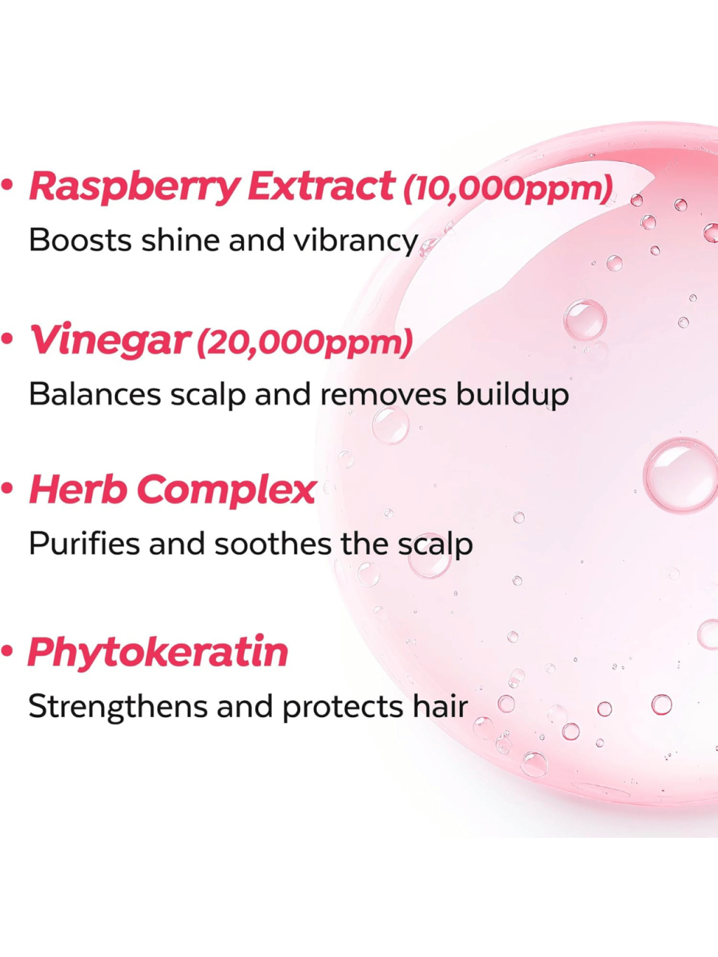 Malinový octový oplach, ktorý po umytí vyrovná pH pokožky hlavy, zjemní vlasy a vráti im žiarivý lesk bez zaťaženia.