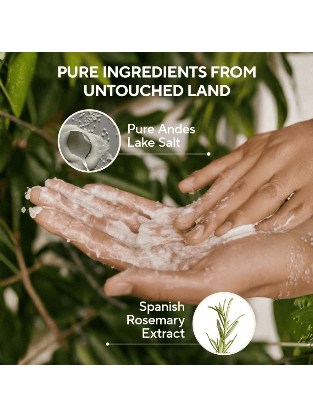 Rozlúč sa s nánosmi a mastnotou - soľný peelingový šampón s rozmarínom hĺbkovo čistí pokožku hlavy, uvoľňuje upchaté korienky a zanechá vlasy ľahké a nadýchané.