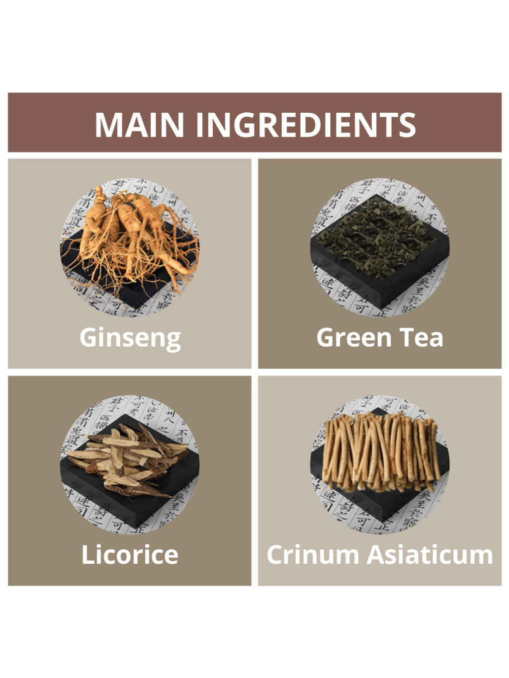 - ✨ Chrysanthemum Boreale, Houttuynia Cordata, Eclipta Prostrata, Sophora Angustifolia - byliny pre komfort pokožky a rovnováhu